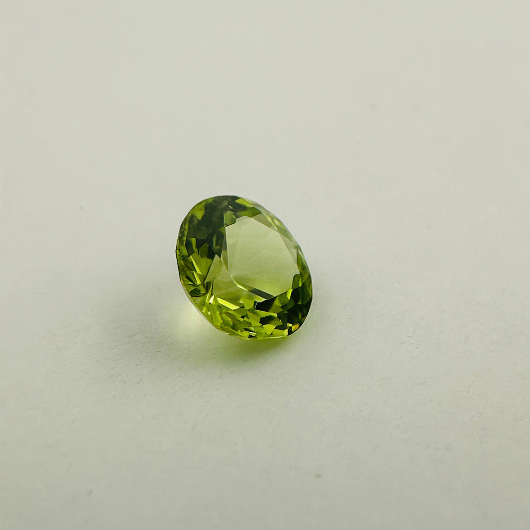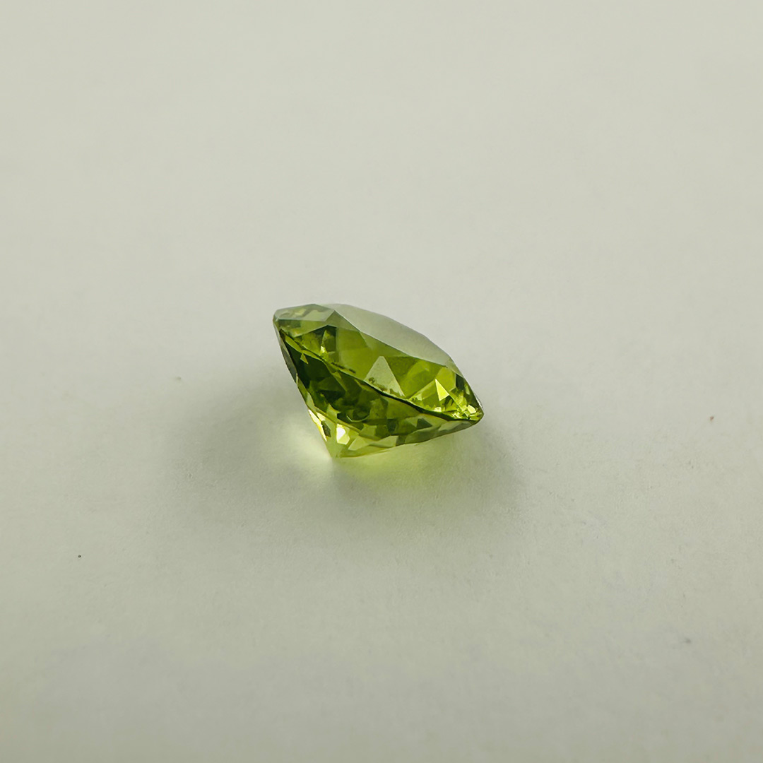 Embrace the refreshing beauty of Peridot, a gemstone cherished for its vibrant green hues and enchanting sparkle. Weighing 0.79 carats and measuring 6 by 3.9 millimeters, this exquisite gem is cut into a classic round shape, allowing its lively green color to shimmer with every movement.